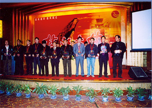 3月21日在成都春季糖酒會上,枝江酒業公司對2004年枝江大曲全國十佳經銷商進行表彰,并重獎銷售狀元,圖為十佳經銷商在頒獎大會上。