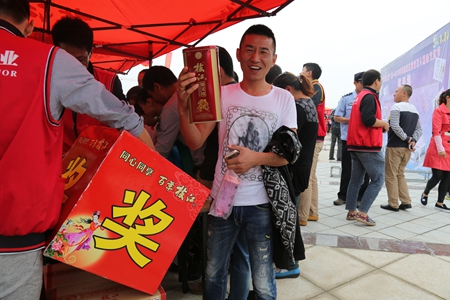 枝江酒業借用這樣的熱鬧場面,在相親活動現場進行微信掃碼贈酒活動,吸引了前來參加相親活動的各階層人士。在現場展示的產品有枝江王、百年枝江韻系列產品、情義結、謙泰吉1號、苦蕎酒等。參與者只要現場關注枝江酒業微信公眾號,分享到朋友圈,即可獲得一次抽獎的機會,分別會抽出“十五年經典”、“枝江情義結”、“小金版枝江王”、“小苦蕎酒”等不同價位的枝江酒。枝江酒業曾經在今年夏天,利用枝江市納涼晚會舉行微信掃碼贈酒活動,與枝江市民有效互動,讓枝江人“家家抱得美酒歸”成為酒城風景,而在此次相親節上,在“千年等一回”的浪漫中,“相親抱得美酒歸”又一次成為枝江這座中國白酒名城的風景。枝江市婦聯準備了豐富的文藝節目,在舞臺的大屏幕上,重復播放著枝江酒業出品的《酒城之戀》畫面,有一位現在枝江工作的外地小伙子說,希望能在枝江收獲一段像《酒城之戀》中的愛情故事。