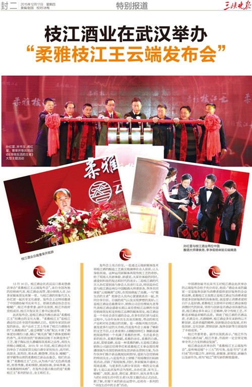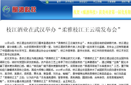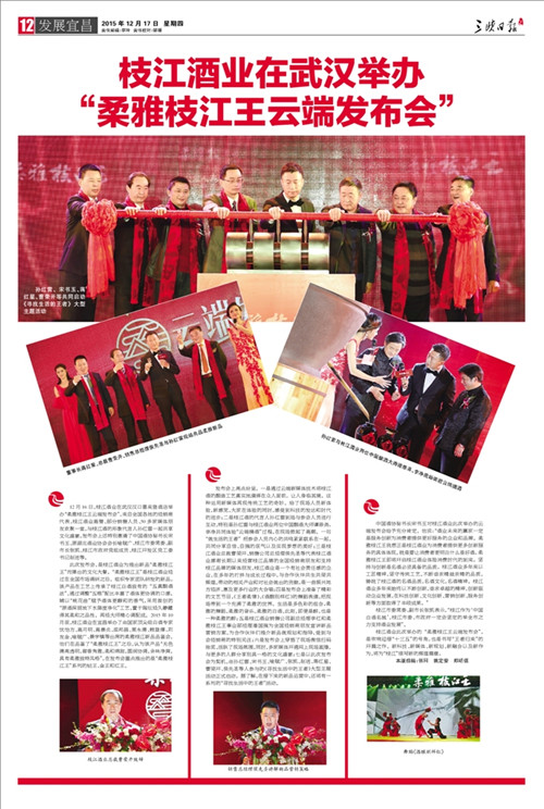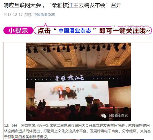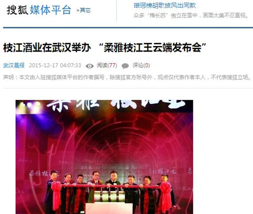 枝江酒業(yè)12月16日在武漢漢口喜來(lái)登酒店舉辦的“柔雅枝江王云端發(fā)布會(huì)”,受到了媒體界朋友的廣泛關(guān)注。兩天來(lái),有近百家媒體報(bào)道和轉(zhuǎn)載。有新華網(wǎng)湖北、中新網(wǎng)湖北、騰訊大楚網(wǎng)、光明網(wǎng)、新民網(wǎng)、新浪、搜弧、中國(guó)網(wǎng)湖北、荊楚網(wǎng)、消費(fèi)日?qǐng)?bào)網(wǎng)、釀酒科技、長(zhǎng)江網(wǎng)、漢網(wǎng)、糖酒快訊、中國(guó)酒業(yè)、中華網(wǎng)、第一農(nóng)經(jīng)等網(wǎng)絡(luò)媒體,有湖北日?qǐng)?bào)、武漢晨報(bào)、三峽日?qǐng)?bào)、三峽晚報(bào)、三峽商報(bào)、湖北畫報(bào)等報(bào)紙媒體;有枝江酒業(yè)12月16日在武漢漢口喜來(lái)登酒店舉辦的“柔雅枝江王云端發(fā)布會(huì)”,受到了媒體界朋友的廣泛關(guān)注。兩天來(lái),有近百家媒體報(bào)道和轉(zhuǎn)載。有新華網(wǎng)湖北、中新網(wǎng)湖北、騰訊大楚網(wǎng)、光明網(wǎng)、新民網(wǎng)、新浪、搜弧、中國(guó)網(wǎng)湖北、荊楚網(wǎng)、消費(fèi)日?qǐng)?bào)網(wǎng)、釀酒科技、長(zhǎng)江網(wǎng)、漢網(wǎng)、糖酒快訊、中國(guó)酒業(yè)、中華網(wǎng)、第一農(nóng)經(jīng)等網(wǎng)絡(luò)媒體,有湖北日?qǐng)?bào)、武漢晨報(bào)、三峽日?qǐng)?bào)、三峽晚報(bào)、三峽商報(bào)、湖北畫報(bào)等報(bào)紙媒體;有湖北電視臺(tái)、三峽電視臺(tái)、枝江電視臺(tái)等電視媒體;有“玩轉(zhuǎn)宜昌”、“酒說(shuō)”等眾多微信平臺(tái)。尤其是微信新媒體,傳播快,關(guān)于“柔雅枝江王云端發(fā)布會(huì)”的報(bào)道被眾多關(guān)注枝江酒業(yè)、關(guān)注柔雅枝江王新品的消費(fèi)者和孫紅雷的粉絲刷屏。湖北電視臺(tái)、三峽電視臺(tái)、枝江電視臺(tái)等電視媒體;有“玩轉(zhuǎn)宜昌”、“酒說(shuō)”等眾多微信平臺(tái)。尤其是微信新媒體,傳播快,關(guān)于“柔雅枝江王云端發(fā)布會(huì)”的報(bào)道被眾多關(guān)注枝江酒業(yè)、關(guān)注柔雅枝江王新品的消費(fèi)者和孫紅雷的粉絲刷屏。